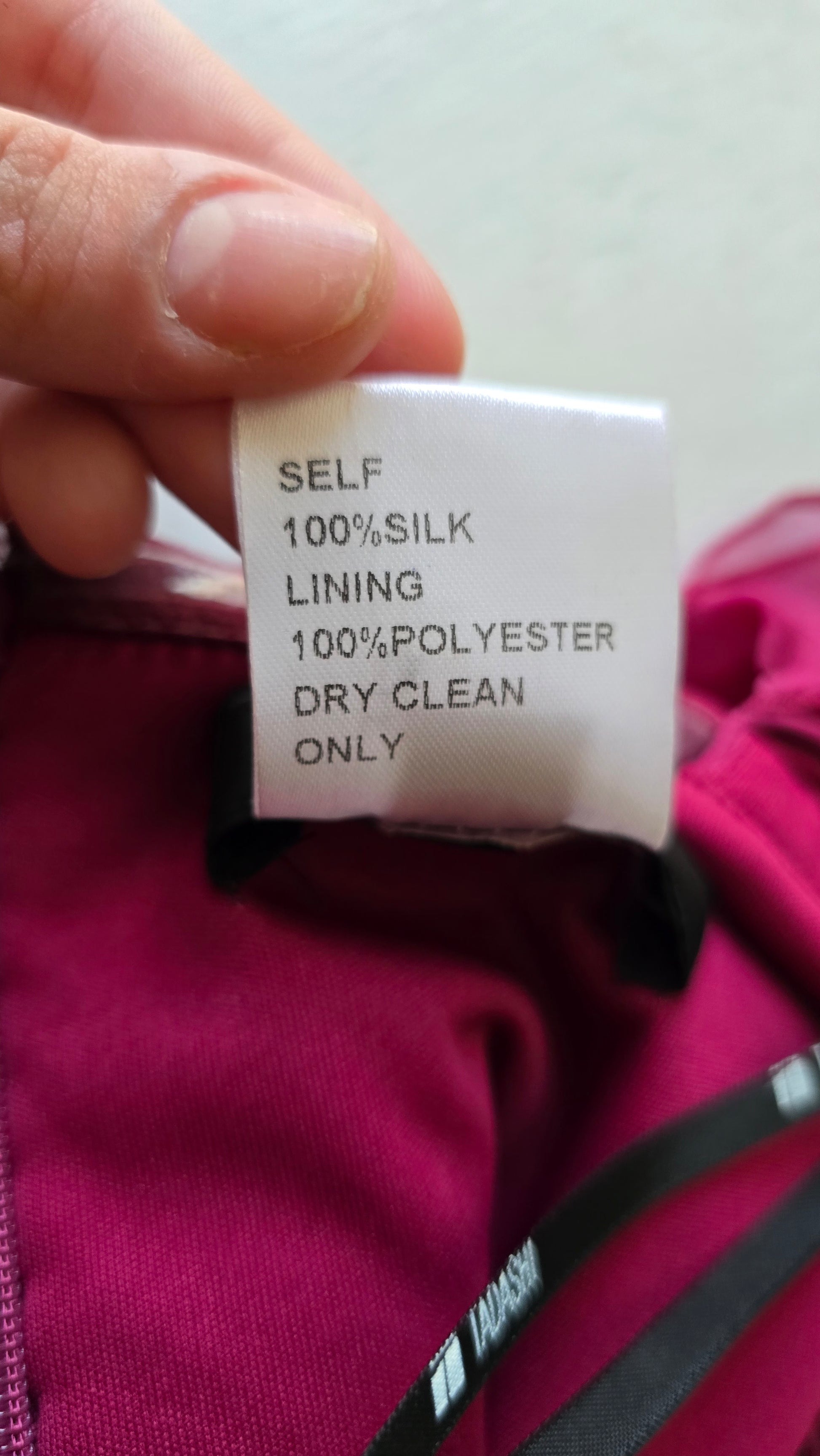Um Tadashi Shoji raro dos anos 1990, construído em camadas sobrepostas de organza de seda em tom magenta profundo. A arquitetura do vestido acompanha o corpo com movimentos diagonais precisos O destaque fica para o ombro único adornado por uma escultura floral, múltiplas pétalas em chiffon, costuradas uma a uma, no estilo característico que marcou o eveningwear da marca nessa década.
