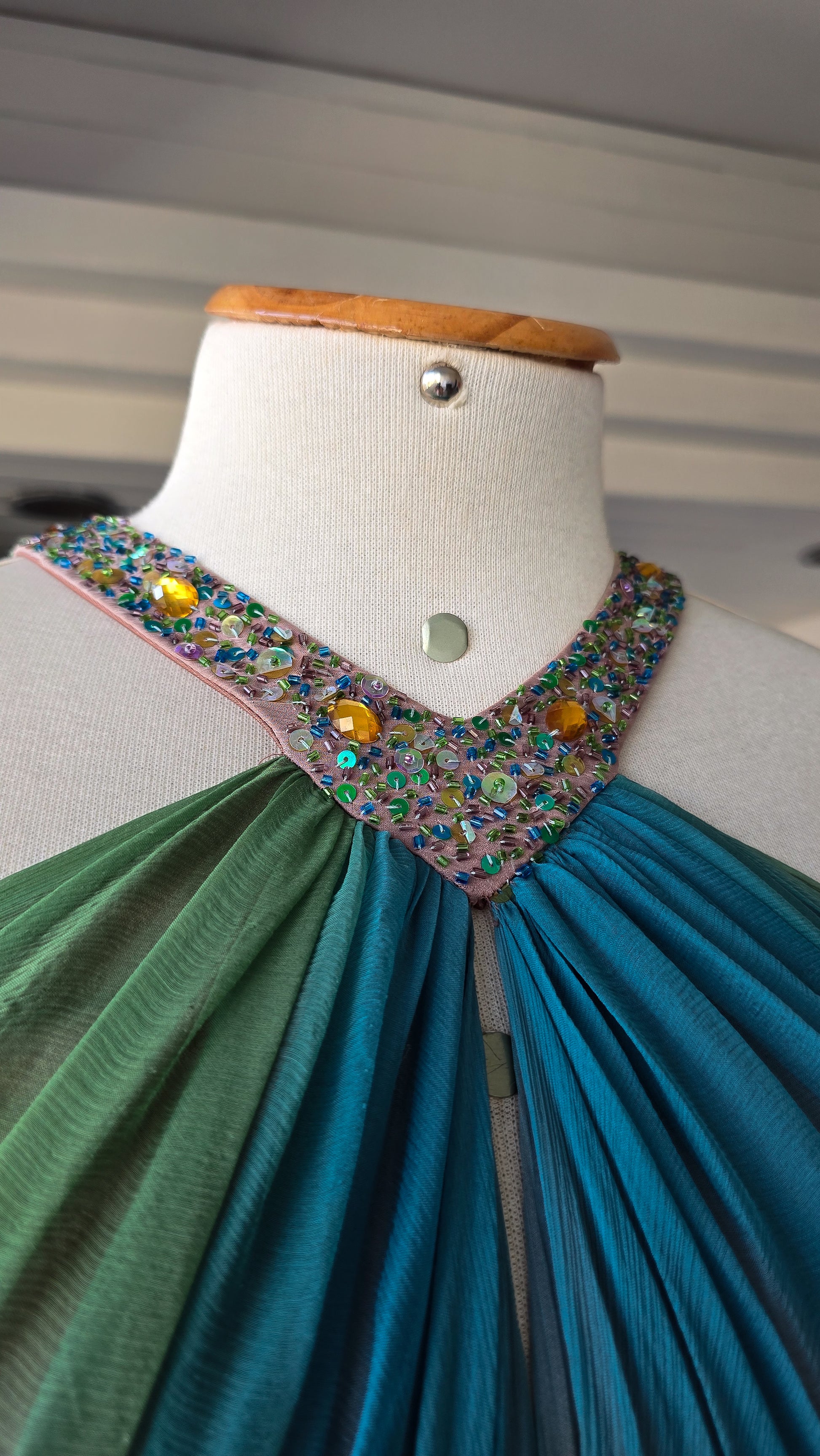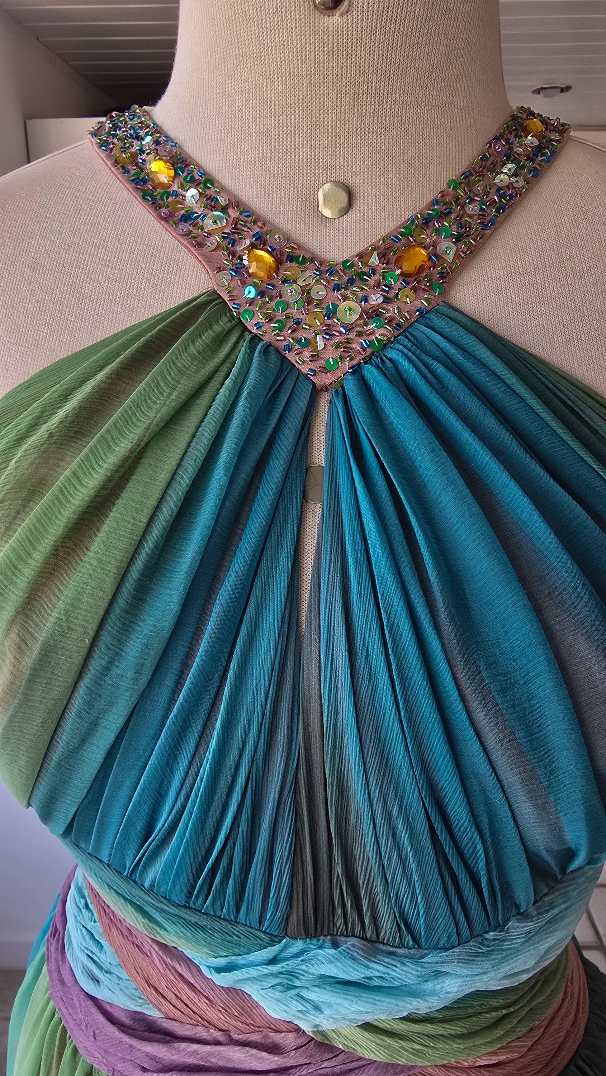 Tecido: Chiffon de seda com plissas finíssimas, leveza extrema (baixíssima gramatura) que cria esse movimento etéreo, transparência difusa e queda esvoaçante. Detalhes: Gola bordada com cristais e paetaria iridescente; plissado manual no busto e na cintura; cruzamentos de seda na parte posterior; acabamento interno limpo e preservado.
