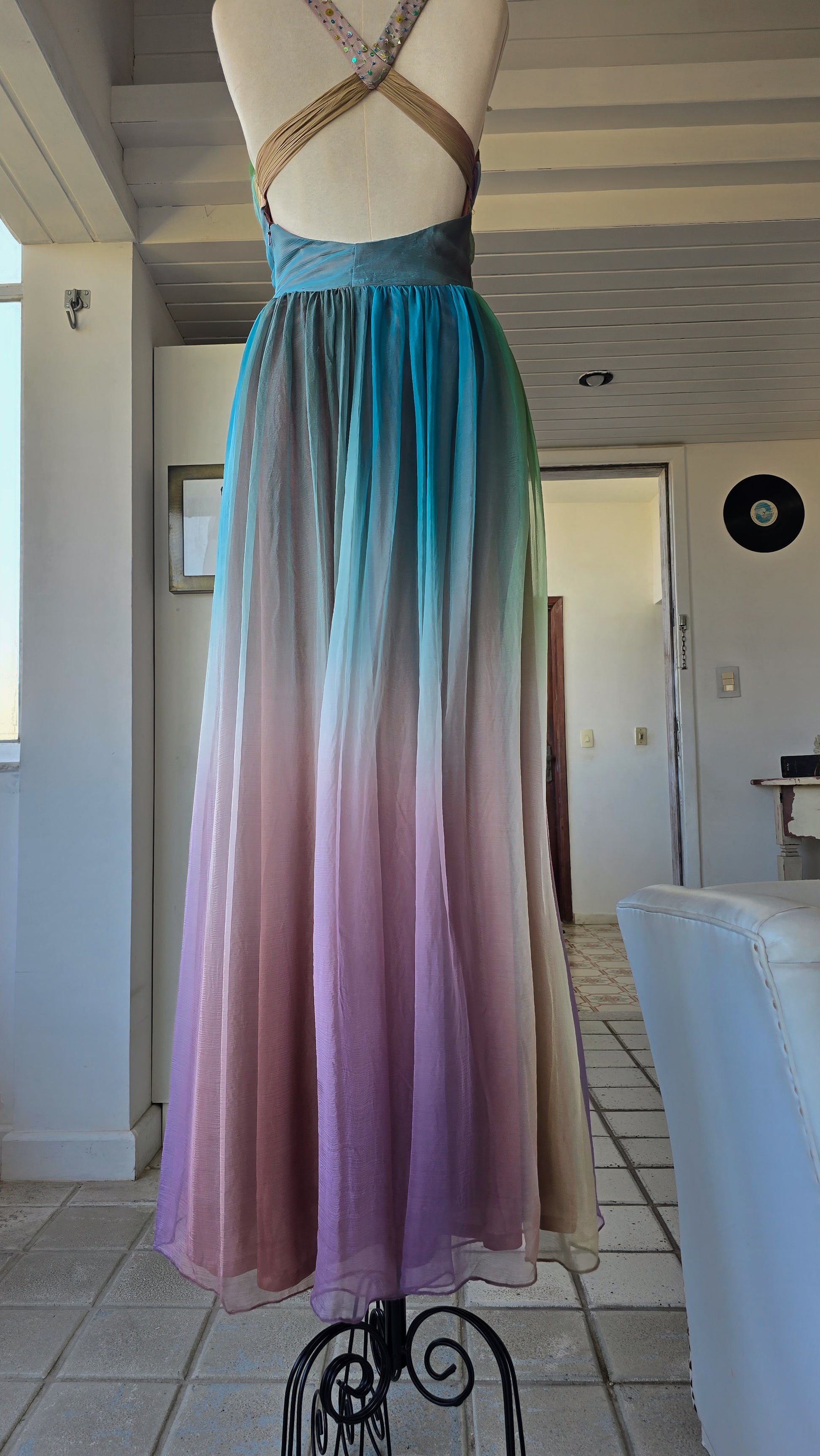 Vestido longo construído em camadas de chiffon de seda levíssimo com degradê vertical que transita entre azul, verde, lilás e tonalidades terrosas de forma contínua e equilibrada.