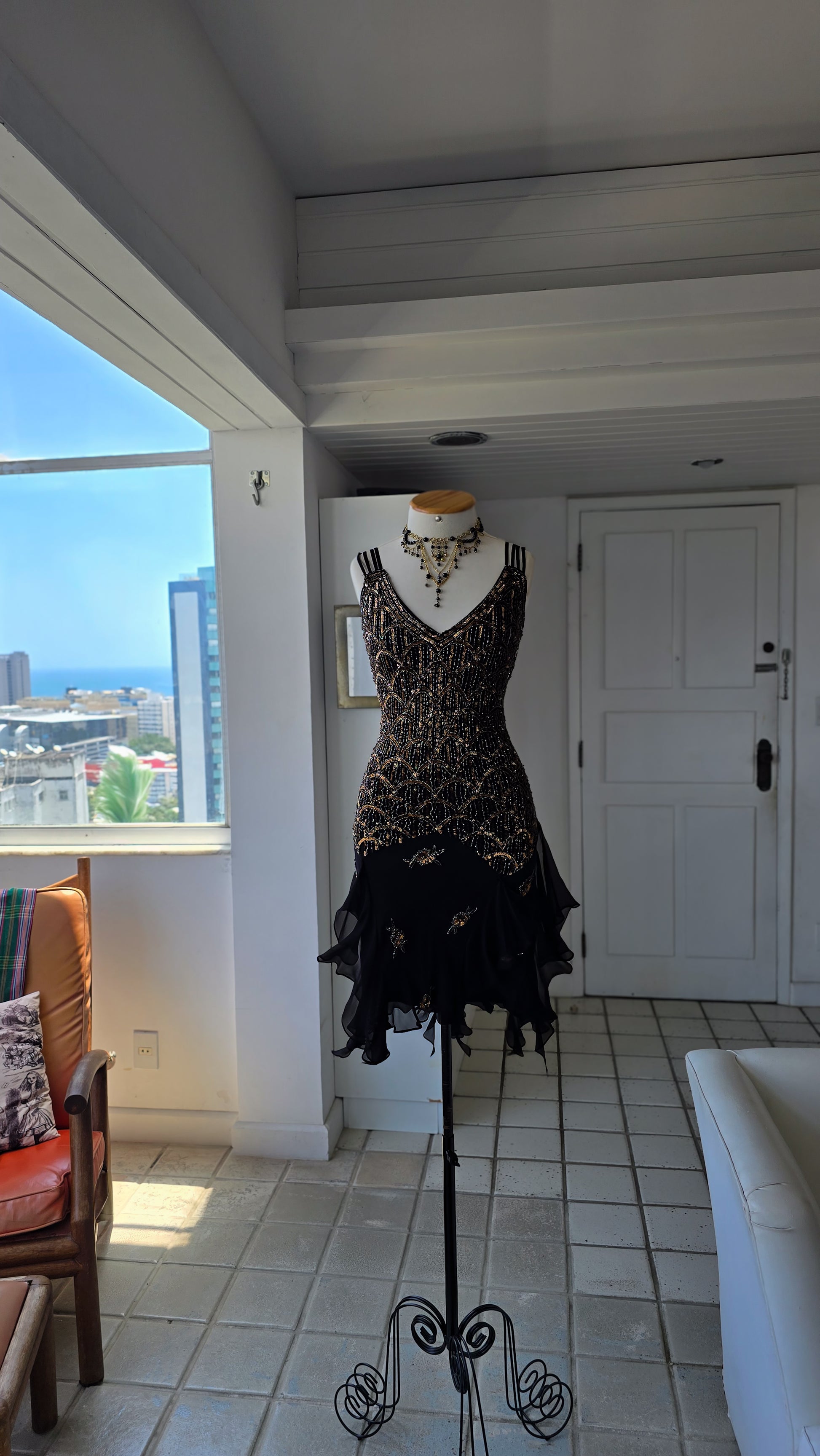 Vestido curto escultural, construído em seda preta de caimento denso e maleável, integralmente bordado à mão em uma paleta de dourados que pendem para o cobre queimado. A superfície é construída em padrões geométricos ascendentes, arcos, linhas e trilhas contínuas, que remetem diretamente à estética Art Déco dos anos 1920, reinterpretada pelas produções de festa dos anos 1990 com brilho mais intenso e profundidade metálica.