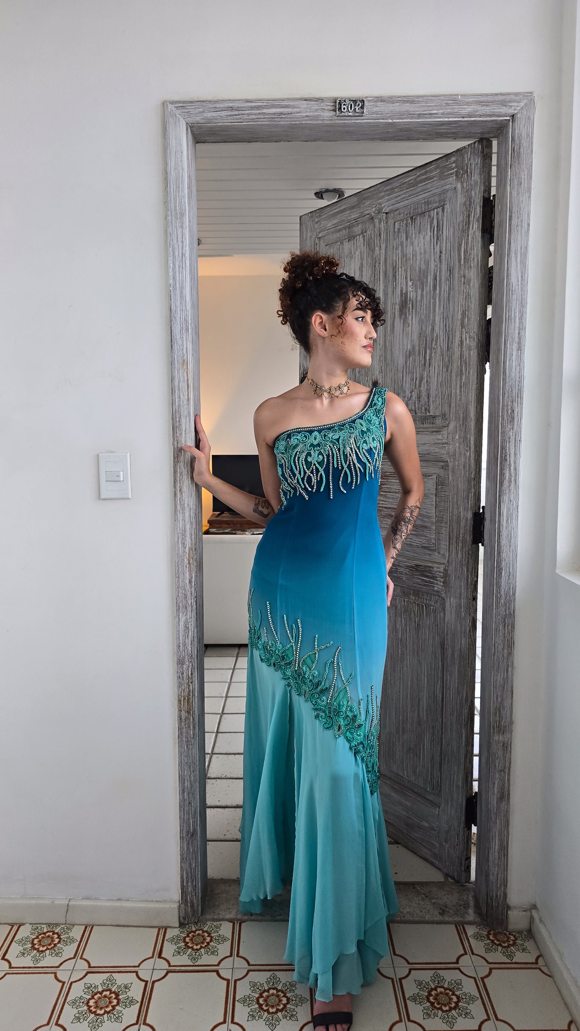 Chiffon de seda turquesa em degradê profundo até o ciano, este vestido revela uma construção primorosa: appliqué de tule ricamente bordado à mão com vidrilhos, canutilhos e cristais que formam desenhos orgânicos, quase subaquáticos, na região do busto e ao longo da barra.
