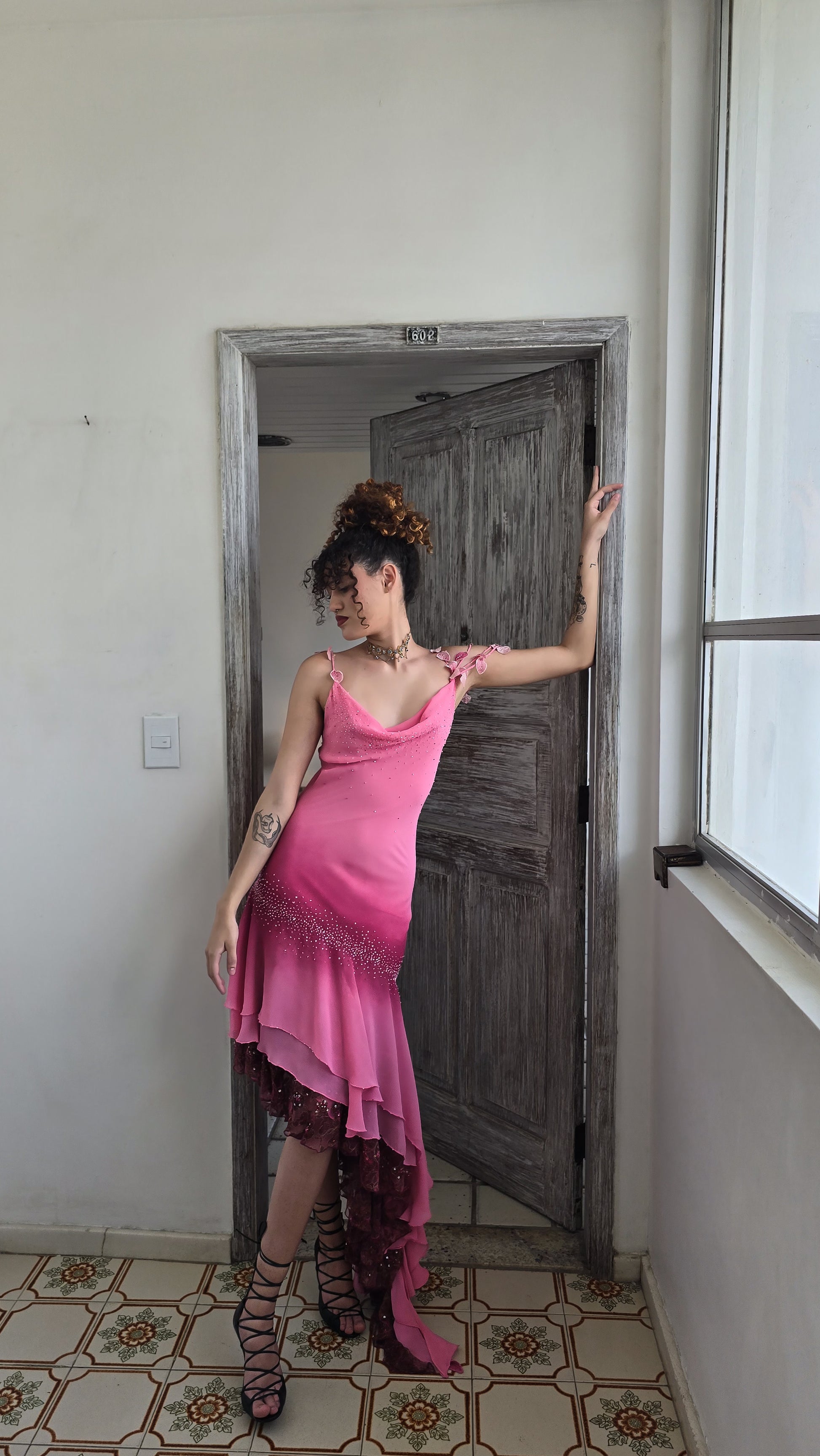 Vestido em chiffon em degradê de rosa intenso a tom framboesa suave, com silhueta que acompanha o corpo até o quadril e se desdobra em uma cauda lateral dramática. O busto traz decote drapeado tipo cowl e alças finas trabalhadas com pequenas pétalas aplicadas, que caem sobre o ombro como folhas suspensas. Na região do quadril, uma faixa densa de cristais cria o efeito de poeira luminosa que circunda todo o corpo. A saia é construída em camadas de chiffon assimétricas, revelando, por baixo, uma segunda camada em renda mauve bordada com paetês e miçangas, visível especialmente quando a peça se movimenta.