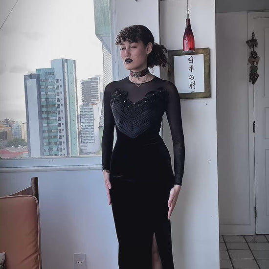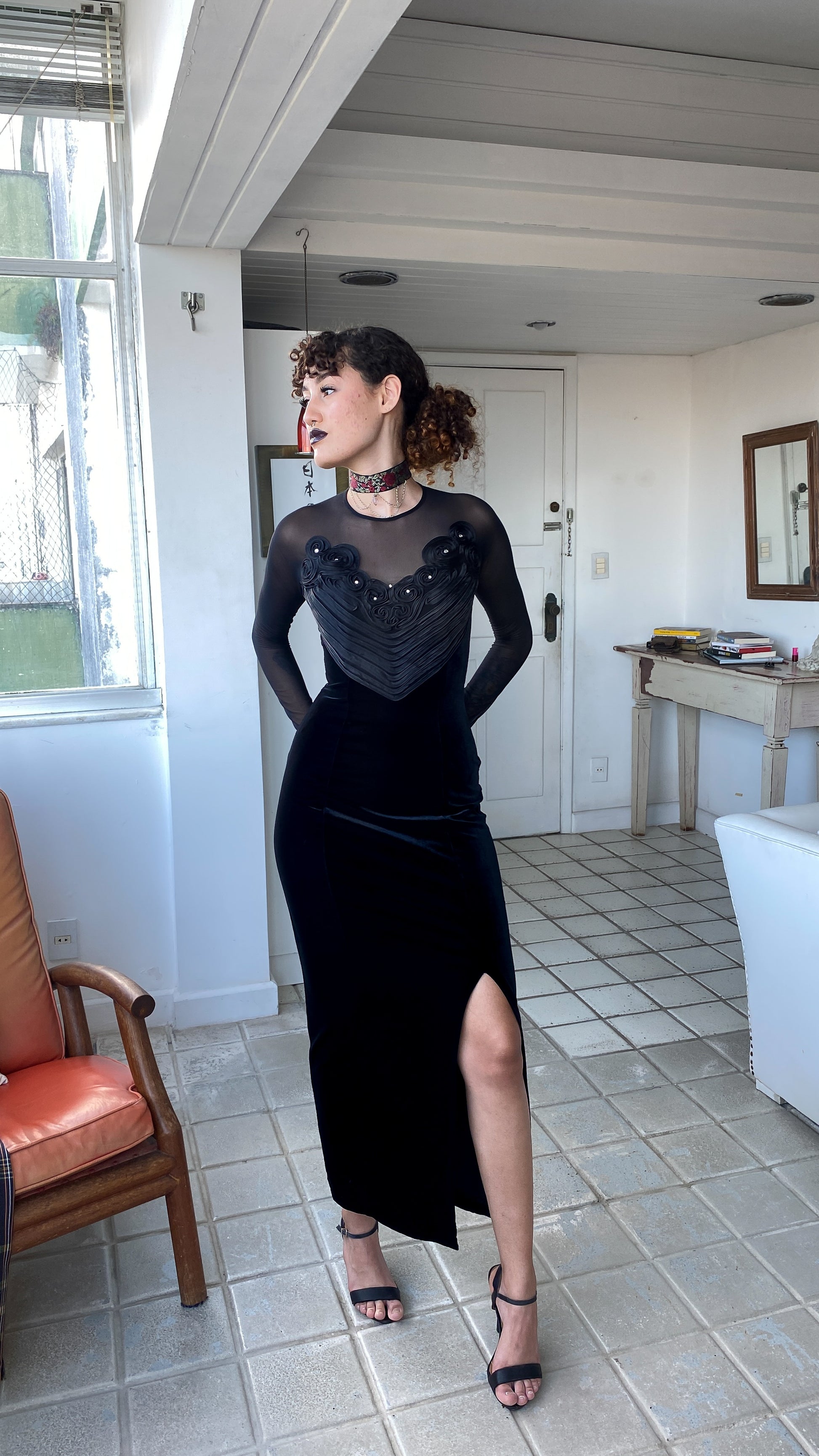 Vestido longo em veludo preto do fim dos anos 80, de construção impecável, elastece mas mantém estrutura e corpo, carcterística de peças dessa época mesmo que estiquem. O contraste entre o corpo em veludo e as mangas em tule transparente cria um jogo de densidade e transparência sofisticado, equilibrando peso e leveza.