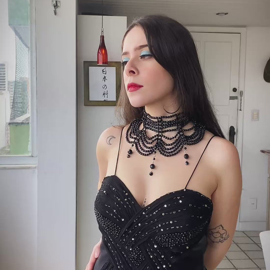 - Aplicações: vidrilhos pretos e paetês bordados à mão