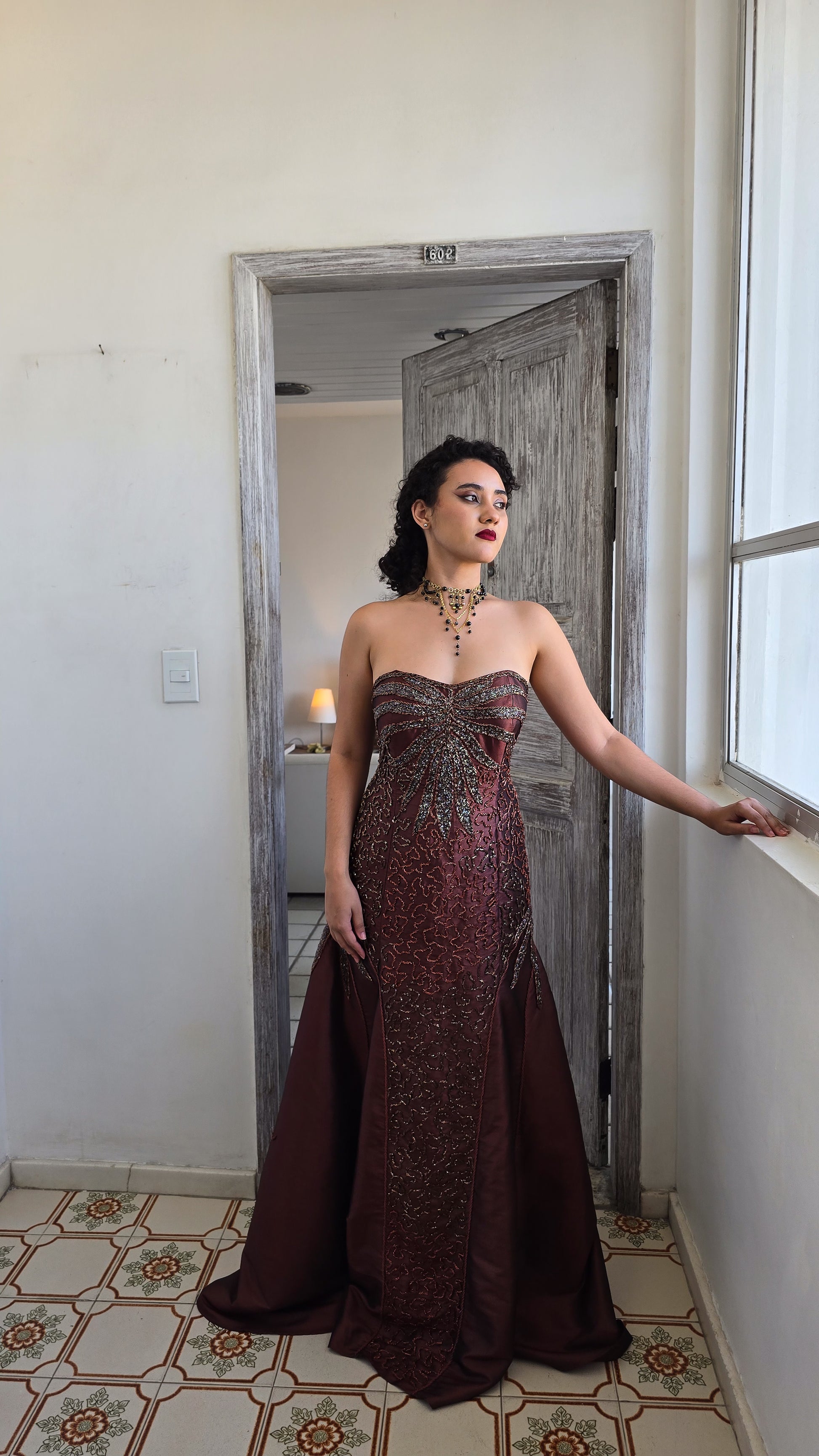 Vestido longo em tafetá changeant, com brilho que varia entre mogno e bronze conforme a luz. O decote coração molda o busto, enquanto toda a frente do vestido é bordada à mão com canutilhos, miçangas e linhas metálicas que formam desenhos orgânicos, quase como raízes luminosas espalhadas pelo tecido.
