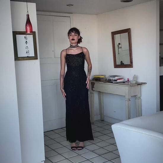 - Detalhes: Bordados manuais em pedrarias negras cobrindo o busto e em arabescos florais descendo pela saia, costas em V profundo com alças cruzadas, barra fluida
