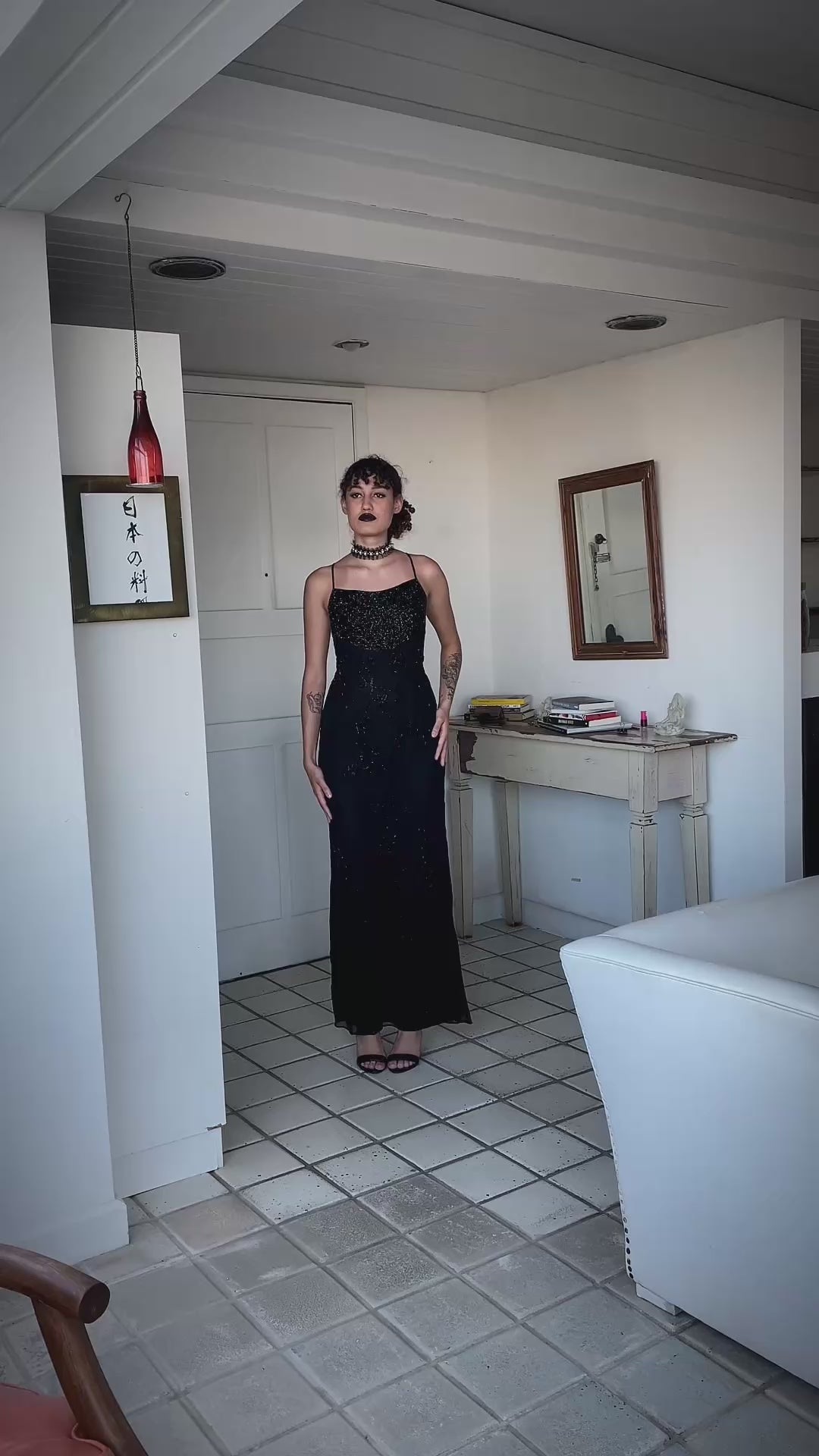 Um vestido dramático, de presença quase literária, em que a beleza sombria lembra os versos de Edgar Allan Poe: Disse o corvo, “Nunca mais.”