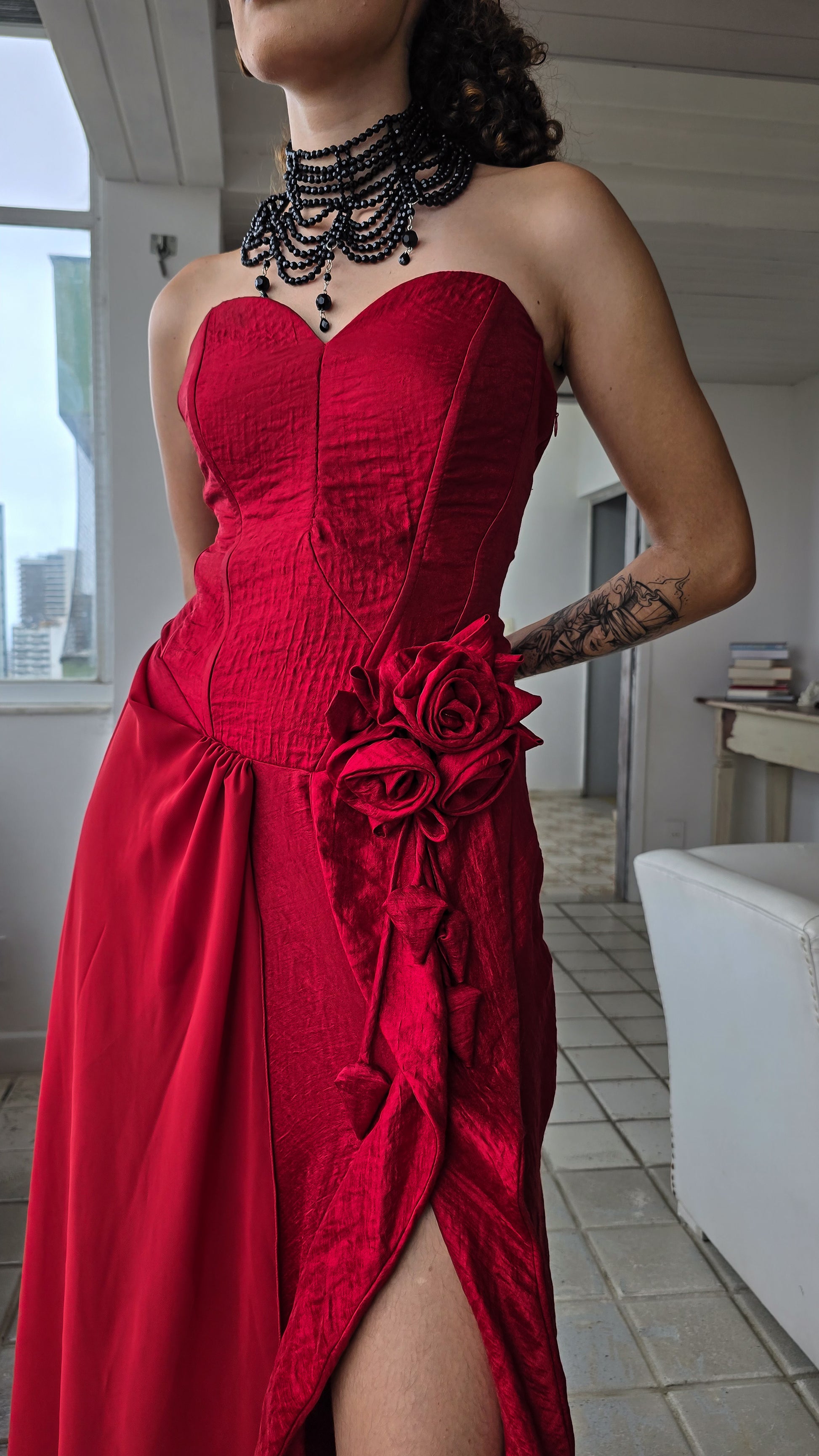 Detalhes: Arranjo tridimensional de rosas, decote coração com costura marcada, fenda frontal com movimento. Barbatanas marcadas e estrutura interna reforçada.