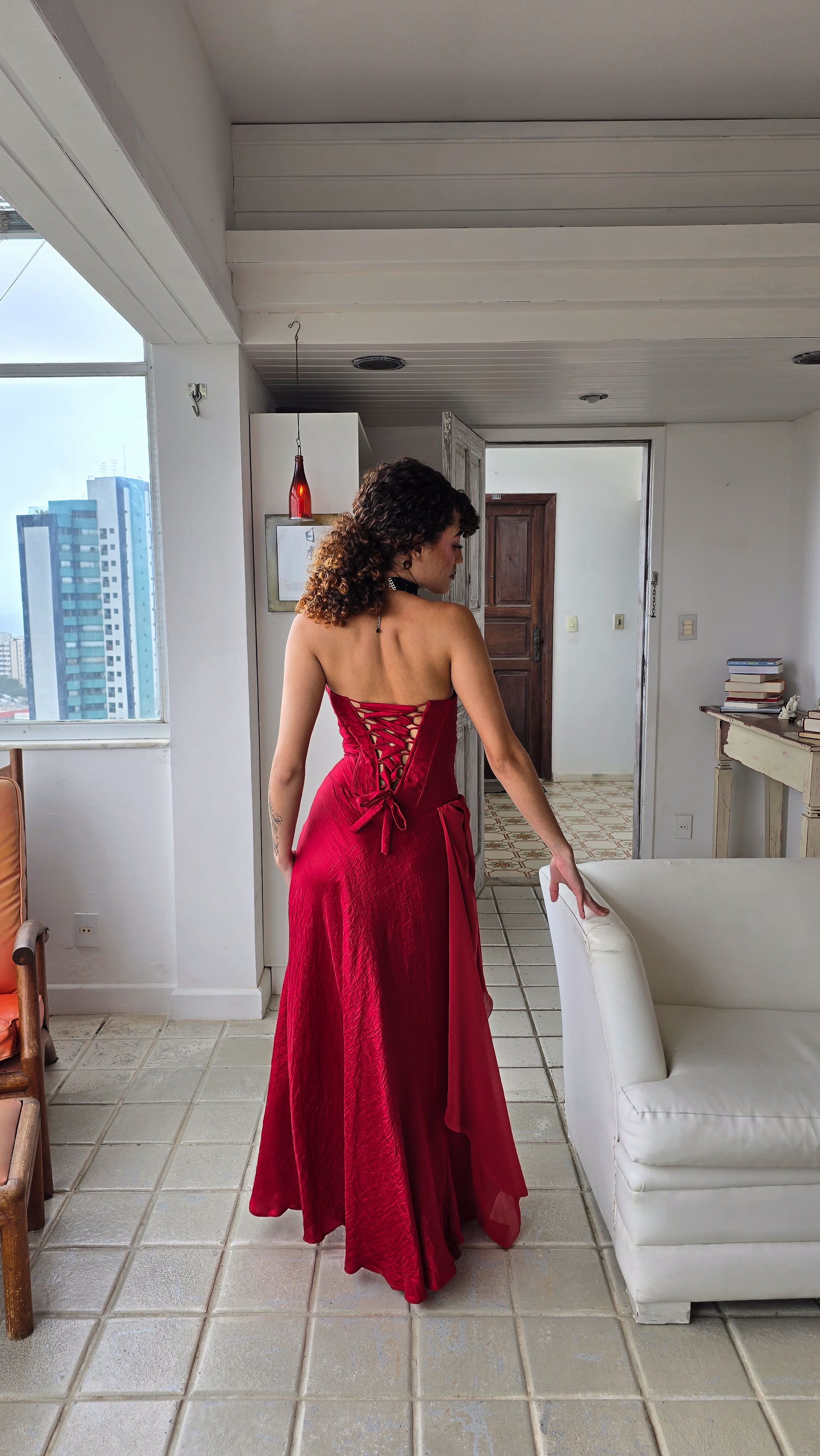 Na lateral, um arranjo tridimensional de rosas percorre a linha do quadril e acompanha a fenda até a barra, criando uma linha de movimento contínuo entre flor, corpo e corte. As fitas grossas e ajustáveis nas costas formam um trançado, que adapta a peça ao corpo com precisão e sofisticação.