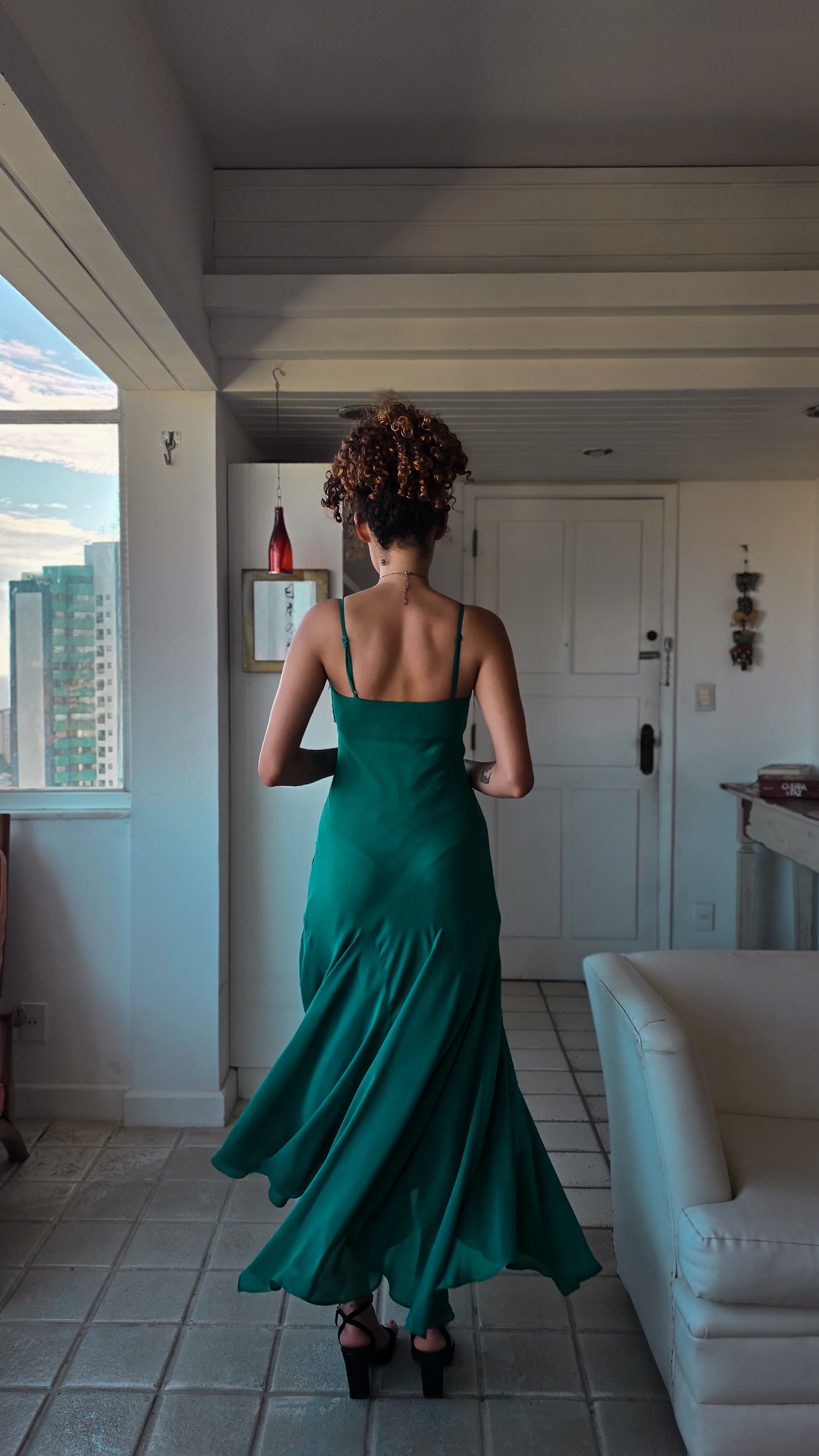 Vestido longo em chiffon verde esmeralda, de brilho suave e movimento contínuo, com corpo drapeado no busto que cria volume controlado e um desenho delicado para o colo. A sustentação em alças finas mantém a leveza da peça, enquanto o franzido central é marcado por um pequeno ponto de luz, um detalhe que concentra o olhar antes que ele se espalhe pelo restante da silhueta.