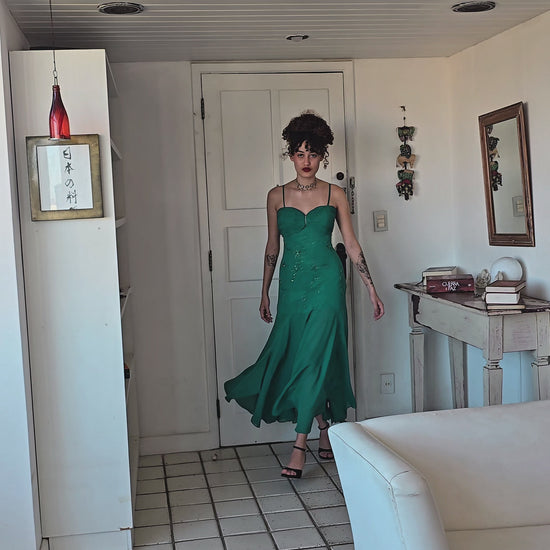 A base do vestido segue fluida e elegante: o chiffon confere leveza, permitindo que a saia se abra em ondas longas e assimétricas a cada passo. Sobre ela, bordados manuais em miçangas verdes formam ramos e pequenas flores que se espalham pelo corpo, destacando-se discretamente no mesmo tom, um trabalho típico das produções dos anos 1990 e início dos 2000.