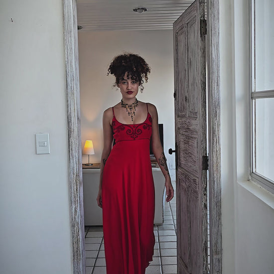 Vestido longo cheio de movimento, confeccionado em crepe vermelho vivo, com caimento fluido e ondulante. O busto recebe bordados manuais em arabescos simétricos, costurados fio a fio em miçangas e canutilhos vermelhos, criando uma superfície luminosa e tátil.